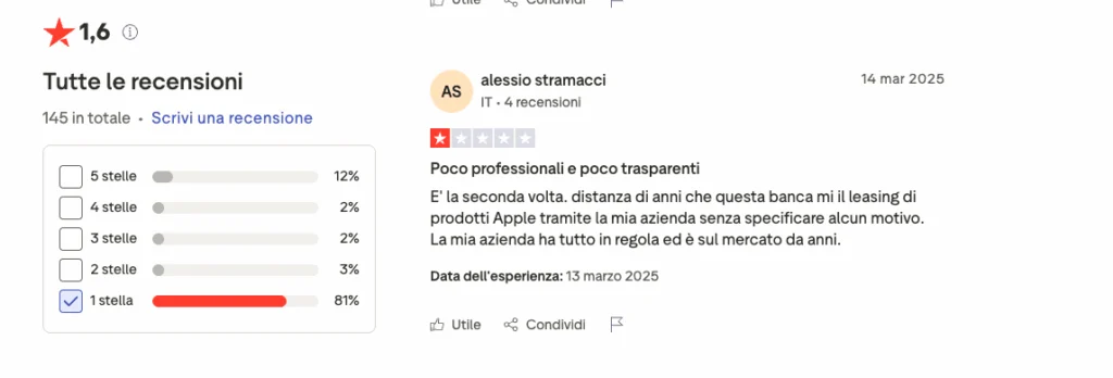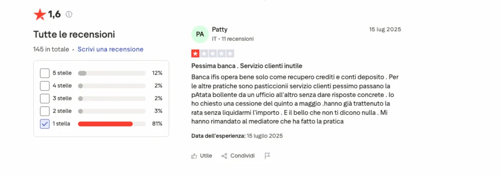 Non mancano le recensioni negative. Su un sito come Trustpilot, il voto dato a Banca Ifis è di 1,6 stelle su 5. A pesare sul giudizio complessivo di Banca Ifis sono le critiche degli utenti sui servizi bancari e sulla gestione delle pratiche come leasing e finanziamenti.