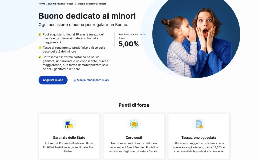 I buoni fruttiferi per minori sono un prodotto finanziario di risparmio rilasciato da Poste Italiane e rivolto ai soggetti da 0 a 16 anni. Sono sottoscrivibili online o direttamente in ufficio postale dal genitore, un parente o da un amico e offrono un rendimento annuo lordo a partire dal 2% fino al 5%.
